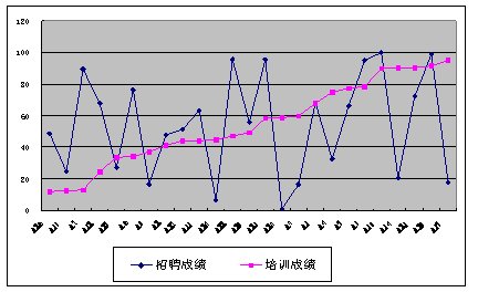 相反,如果培訓(xùn)成績(jī)和工作績(jī)效的關(guān)系如圖5,從中我們可以看出,培訓(xùn)的成績(jī)和招聘的成績(jī)表現(xiàn)出很強(qiáng)的正相關(guān),說(shuō)明培訓(xùn)成績(jī)好的人,其工作績(jī)效相應(yīng)好,培訓(xùn)成績(jī)差的人,其工作績(jī)效也差,說(shuō)明培訓(xùn)是有效的。