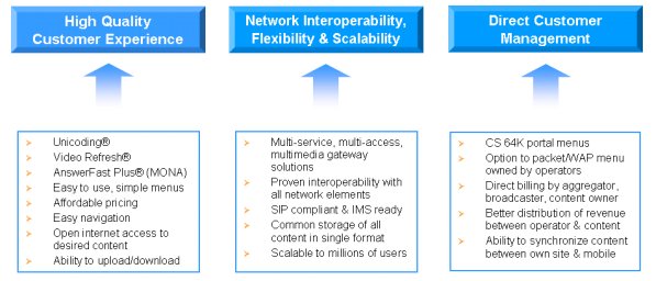 Refresh®和AnswerFast Plus® (MONA的一部分),同時(shí)多媒體網(wǎng)關(guān)解決方案也包括在內(nèi)。其它方面的可互操作性和用戶體驗(yàn)改善問題很容易能解決,對今天現(xiàn)有的WAP服務(wù)是一種補(bǔ)充。