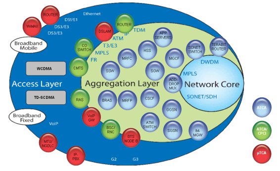 在匯聚層與核心網(wǎng),對(duì)高可用性、傳輸容量與事務(wù)處理能力要求很高。ATCA通常是高性能的最佳選擇。mTCA與ATCA可對(duì)電信網(wǎng)中要求的操作性與高可用性提供與生俱來(lái)的支撐,而其它IT技術(shù)卻做不到。ATCA與mTCA作為一種系統(tǒng)技術(shù),是電信級(jí)業(yè)務(wù)與商用組件之間自然而然的選擇。