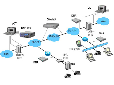 以上兩種測試方法也可以結合使用,在進行端到端VQT測試時,在NGN網絡的中間網段(根據需要可以設置多個監(jiān)測點)部署分布式網絡分析儀(DNA),進行被動式RTP/RTCP監(jiān)測,從而判斷出造成語音質量下降的環(huán)節(jié)所在。如下圖所示: