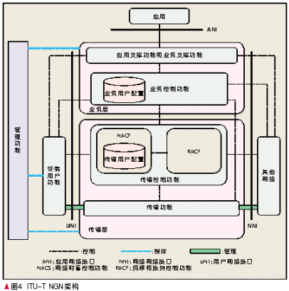 ITU-T下一代網(wǎng)絡(luò)的主要架構(gòu)如圖4所示,NACF是NGN傳輸層的功能實體,正對應(yīng)于TISPAN NGN架構(gòu)中的NASS。