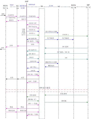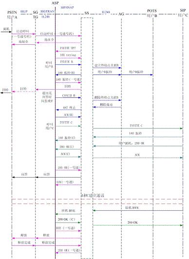 圖2為PSTN用戶A撥打一號通用戶,順呼軟交換域AG下POTS用戶B和SIP用戶C,其中軟交換和應用服務器以SIP協(xié)議相連,軟交換和AG、軟交換和TG以H.248協(xié)議相連。可以看到,用戶B首先振鈴,振鈴達到規(guī)定時間后,應用服務器取消了對用戶B的振鈴,轉而對用戶C振鈴。用戶C摘機應答,通話結束,用戶C掛機,系統(tǒng)釋放了呼叫。