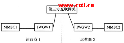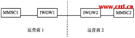 網(wǎng)間多媒體消息業(yè)務(wù)互通采用的是利用互聯(lián)網(wǎng)關(guān)(IWGW)的方式,網(wǎng)間IWGW互聯(lián)可以由兩個(gè)運(yùn)營商的IWGW直接連接,也可以經(jīng)過第三方互聯(lián)網(wǎng)關(guān)轉(zhuǎn)接。IWGW之間采用基于TCP/IP的專線連接方式或互聯(lián)網(wǎng)連接。多媒體消息互通結(jié)構(gòu)如圖1、圖2所示。