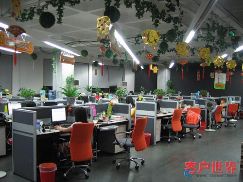 整個服務現(xiàn)場的裝修以桔黃色為主色調(diào),代表溫暖、和諧;格局不規(guī)則化,盡顯現(xiàn)代時尚的風格;辦公室到處是綠色植物,墻上貼滿了各種相片、海報和宣傳語,天花板掛滿了激勵口號板;別具特色的洗手間文化;乒乓球室、休息室、休閑吧,咖啡機、茶葉、果汁、雪糕、飲料,魚缸、大液晶電視、音響……一點感覺不到這是一個枯燥的呼叫中心的工作環(huán)境。