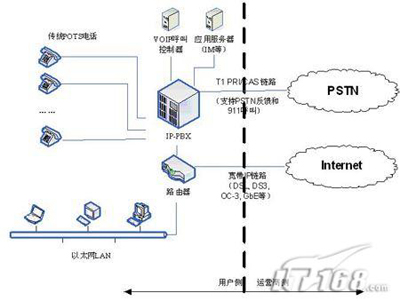 相反,在傳統(tǒng)的PBX或新興的IP-PBX中,這些功能模塊通常配置在用戶側的網(wǎng)絡元素上,而且通過一條或多條專用線路T1(傳統(tǒng)PBX)或DSL(新興PBX)連接到中心辦公室,用PSTN的連接。圖1說明了PBX和Centrex服務的區(qū)別。而且,DSL還能在相同的鏈路支持語音和數(shù)據(jù)的傳輸,而且維護鏈路的成本也遠遠小于維護T1所需的代價。另外,由于呼叫控制能夠在本地裝載,而IP-PBX能夠支持Internet連接,因此每23(T1-PRI)或24(T1-CAS)個電話終端就不再需要一條專用線路T1的支持了。(后續(xù)將進一步說明)