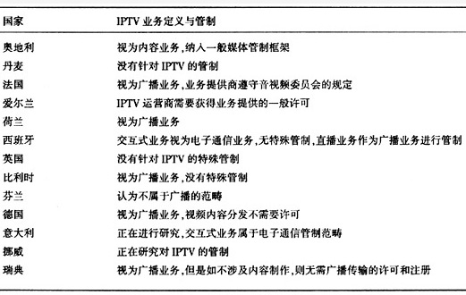 歐盟在1997年發(fā)表的融合綠皮書《邁向信息社會之路》中明確指出不同的網絡平臺都能一同傳送電話信息、電視信息、電腦信息和數據,并于2003年開始實施《電子通信網絡與服務的統一監(jiān)管框架》,1997年融合指令和2003年統一監(jiān)管框架推動了歐盟各國業(yè)務融合的發(fā)展,歐盟大多數國家均開放了有線電視和電信市場,允許彼此進入。在實現管制融合的國家,對電信運營商提供IPTV基本沒有準入方面的限制。但是由于各國對IPTV定義和認識的不同。IPTV所屬的業(yè)務類別也有所差異,從而帶來了管制上的差別。