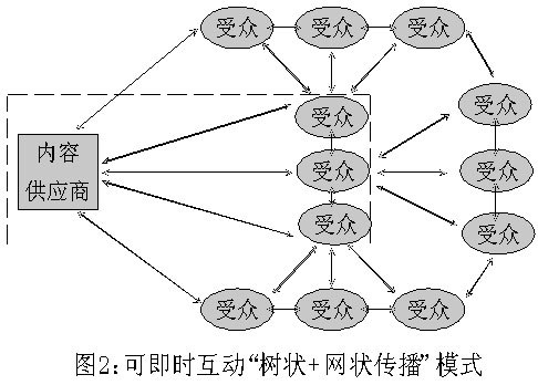 從傳播學(xué)角度分析,傳統(tǒng)媒體傳播方式是“樹狀傳播”,是點(diǎn)對(duì)面的單向傳播,即從一個(gè)信息源(樹根)向受眾(樹葉)作單向傳播(見圖1)。受眾(樹葉)向信息源(樹根)的反饋,是滯后的、非同介質(zhì)的(讀者來信、來電等),傳播和反饋不能同步進(jìn)行。而新媒體的傳播方式則是“網(wǎng)狀傳播”,即它是一個(gè)漁網(wǎng)式的傳播網(wǎng),網(wǎng)上的任意一個(gè)節(jié)點(diǎn),都可以向其他任意一個(gè)節(jié)點(diǎn)或節(jié)點(diǎn)群作點(diǎn)對(duì)點(diǎn)、點(diǎn)對(duì)面的單向或雙向互動(dòng)式傳播,傳播者和受眾之間可以即時(shí)互動(dòng),信息反饋可以即時(shí)進(jìn)行,傳和受的位置可以即時(shí)互喚。