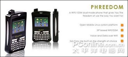 很多技術(shù)分析人士都認(rèn)為,VoWiFi的下一波功能將主要集中在雙模手機(jī)上,即手機(jī)擁有Wi-Fi IP電話功能和普通蜂窩電話功能。當(dāng)用戶位于家中、辦公室或公共Wi-Fi熱點(diǎn)區(qū)域,可以使用Wi-Fi IP電話功能進(jìn)行通話,而在沒有Wi-Fi網(wǎng)絡(luò)的地區(qū),則可以使用傳統(tǒng)的蜂窩網(wǎng)絡(luò)進(jìn)行通話。不論采用哪種網(wǎng)絡(luò),用戶的手機(jī)號碼是唯一的。由于通過Wi-Fi網(wǎng)絡(luò)撥打IP電話的費(fèi)用要低于現(xiàn)有的固定電話,因此未來這種電話很可能會取代大部分用戶目前使用的固定電話。下圖為GUPP公司最新推出的VoWiFi/GSM雙模Linux智能手機(jī)PHREEDOM