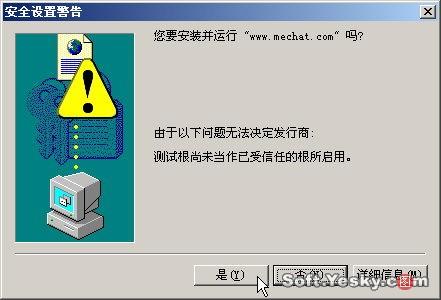 初次進(jìn)入MeChat聊天室,瀏覽器會彈出如圖25所示的安全設(shè)置警告,單擊“是”,然后程序會自動下載安裝MeChat語音與視頻聊天插件。