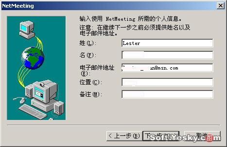 首次運(yùn)行Netmeeting,軟件會出現(xiàn)一個向?qū),要求對用戶信息進(jìn)行簡單的設(shè)定,單擊下一步,輸入個人信息,如圖4所示:
