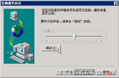 單擊“下一步”跳過Netmeeting服務(wù)器設(shè)置,此時向?qū)髮τ?jì)算機(jī)聲卡和麥克風(fēng)進(jìn)行測試,如圖5。