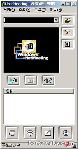 Netmeeting界面下方有四個按鈕,分別對應(yīng)了“共享”、“聊天”、“白板”和“傳送文件”四項(xiàng)主要功能(這四項(xiàng)功能需要在會議屬性中啟用,否則在會議中處于不可用狀態(tài))。