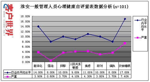 目前,員工壓力和心理健康情況已成為困擾整個(gè)行業(yè)的主要問題之一,我們通過專業(yè)方法對淮安中心的員工心理健康和壓力狀況進(jìn)行了科學(xué)的測量,以了解該中心員工的壓力和心理健康狀況,具體測量數(shù)據(jù)如下: