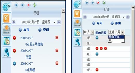 我們用過OUTLOOK的電子日程和手機自帶的日程功能都知道,電腦本機和手機實現日程管理都又各自很大的局限性,優(yōu)你客巧妙的實現了日程的網絡化管理并可以捆綁在手機提醒上,獨特又實用。其中紅綠日程各自代表工作和個人事務,其中工作日程還能共享給上級。