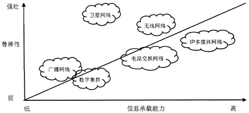 圖2 各種通信網(wǎng)絡的魯棒性和信息承載能力分析