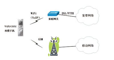 WiFi/GSM雙模手機既可以接入無線局域網WLAN,實現(xiàn)VoIP(VoiceoverIP)功能,又可以接入蜂窩網,實現(xiàn)移動通信功能。但傳統(tǒng)的WiFi/GSM雙模手機在進行WiFi網絡和GSM網絡之間的切換時,無法實現(xiàn)無縫切換,用戶體驗比較差,因此前幾年這種雙模終端發(fā)展得并不理想。
