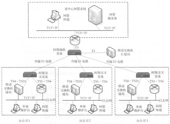 同樣以移動(dòng)網(wǎng)為例,例子中移動(dòng)交換機(jī)到維護(hù)終端支持TCP/IP方式,分公司具有本地維護(hù)終端和網(wǎng)管終端兩種類型的維護(hù)臺(tái)。本地維護(hù)終端通過(guò)以太交換機(jī)直接與移動(dòng)交換機(jī)相連;網(wǎng)元和網(wǎng)管終端通過(guò)以太網(wǎng)接入邊緣路由器,經(jīng)路由器接.el轉(zhuǎn)化以El方式接入到時(shí)隙抽取設(shè)備中,由于傳送網(wǎng)管信息占用帶寬較小,