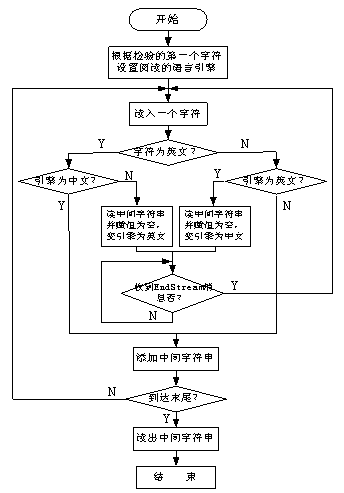 Sam,這樣就實現(xiàn)了中英文混合文本的朗讀。具體的解決方案是:依序處理文本中每個字符,判斷字符中含有的中英文類型,若類型與前一字符相同則添加至中間變量,否則朗讀中間變量文本并保存當前位置,接著切換引擎。文本朗讀結束,發(fā)出EndStream消息,從當前位置繼續(xù)循環(huán)。其流程圖如圖4所示。