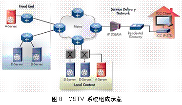 獲取服務(wù)器(A-Server,Acquisition Servers)是從本地或者遠(yuǎn)端的視頻源實(shí)時(shí)獲取內(nèi)容并提供視頻組播服務(wù)。分發(fā)服務(wù)器(Distribution Servers)是用于從運(yùn)營商網(wǎng)絡(luò)中的多個(gè)采集點(diǎn)分發(fā)視頻內(nèi)容以保證視頻的快速傳送以及最快的頻道切換時(shí)間。在用戶側(cè)的IP機(jī)頂盒則運(yùn)行微軟公司獨(dú)有的軟件和協(xié)議以保證最優(yōu)的性能。