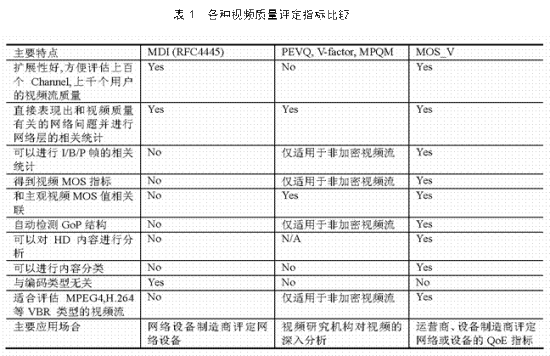 MOS_V,另一種是視頻的全參考(Full Reference)質(zhì)量評定。幾種評定方面的簡單比較如表1所示,相應(yīng)指標(biāo)的介紹可以參考《電信網(wǎng)技術(shù)》2007年第12期的《IPTV QoE測試指標(biāo)概述》。