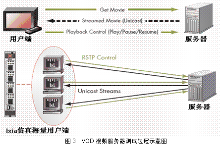 IXIA視頻測試方案可以很好地對VOD視頻服務(wù)器進(jìn)行支持,由于目前各個(gè)廠家對VOD業(yè)務(wù)所采用的RTSP控制協(xié)議進(jìn)行了不同程度和不同方式的修改和定制,要和VOD服務(wù)器進(jìn)行互通有一定的難度,IXIA根據(jù)這一特定的測試要求,可以對RTSP的流程進(jìn)行靈活定制和調(diào)整,支持RTSP各個(gè)命令信息交互的定制,支持的命令包括Describe,Setup,Play,Pause,Get Parameter,Set Parameter,Teardown等,這些靈活的特性可以保證IXIA能夠和業(yè)界幾乎所有的VOD服務(wù)器進(jìn)行互通并進(jìn)行性能測試。這是IXIA在視頻服務(wù)器測試方面非常重要的特性。目前,IXIA是Seachange公司視頻服務(wù)器認(rèn)證的測試工具。可以和Thompson,Bitband,Harmonic,Darwin以及Windows Media Server等業(yè)界常見的視頻服務(wù)器互通并提供性能測試。圖3是VOD服務(wù)器交換過程與IXIA進(jìn)行性能測試示意。