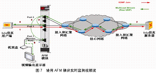 另外一種常見的應(yīng)用場景是對網(wǎng)絡(luò)中存在的IPTV組播流和單播流能夠進(jìn)行被動(dòng)實(shí)時(shí)監(jiān)測并能夠評估相應(yīng)視頻流的視頻質(zhì)量。IXIA獨(dú)特的視頻流提取模塊AFM支持該特性的測試(見圖6)。