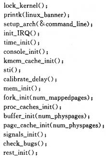 在系統(tǒng)啟動后,最先調用的是針對32位微處理器MCF5249的特定的arch文件夾內mmcontr.S文件。最后跳到main.c中的start_kernel()。μClinux/Linux-2.4.X/init/main.c中包含了對Linux系統(tǒng)初始化的代碼。其中stan_kernel()包含主要的初始化代碼。