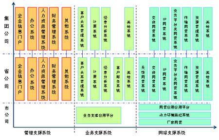 從系統(tǒng)的部署來看,主要集中在集團與省公司,其中,集團公司系統(tǒng)主要具備面向全公司的企業(yè)管理、經(jīng)營分析等功能;省公司從以職能管理為主逐步轉(zhuǎn)變?yōu)橐陨a(chǎn)管理為主,具有了越來越多的生產(chǎn)職能,在運營支撐系統(tǒng)建設中的作用更加突出;市公司的生產(chǎn)管理職能有所削弱,將主要負責市場的具體營銷、客戶支撐以及設備的現(xiàn)場維護等工作,F(xiàn)有系統(tǒng)主要存在以下幾個問題: