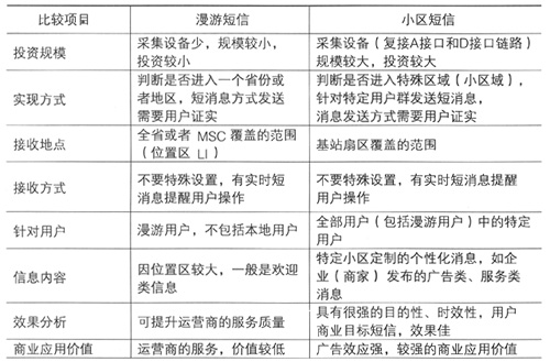 兩個系統(tǒng)最大的不同點是接收短信的范圍和用戶不一樣,漫游短信是針對漫游用戶在一個相對較大區(qū)域內(nèi),因此只適合運營商發(fā)一般性的問候短信,提高運營商的服務質量;小區(qū)短信則是在一個較小的區(qū)域內(nèi)(特定地點),針對特定用戶(可能包括漫游用戶),在一個特定的時間,發(fā)送特定的消息,因此這種消息具有較強的針對性,具有較高的商業(yè)用戶價值,可用于企業(yè)(商家)發(fā)布廣告和服務類的信息,能夠成為一種典型的增值服務。