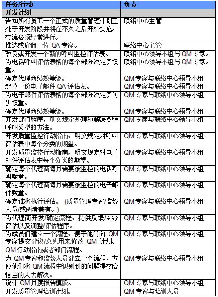 4. 開展項(xiàng)目交流。管理人員必須就新的或者修繕后的QM計(jì)劃與代理商進(jìn)行交流。QM的成功與否與代理商的合作密不可分,如果代理商受邀參與新QM計(jì)劃的開發(fā)并且所有改變都在雙方之間明確交流過,那么成功的機(jī)會(huì)也將大大提高。交流的內(nèi)容應(yīng)包括為什么要開發(fā)這樣一個(gè)計(jì)劃,它的作用和職責(zé)是什么,它對(duì)代理商會(huì)產(chǎn)生哪些影響(對(duì)于他們的評(píng)估和提升)以及它能帶來哪些好處。幫助代理商認(rèn)識(shí)到QM計(jì)劃積極的一面很重要,因?yàn)橹挥羞@樣才能讓他們看到QM不僅僅是管理人員用來告訴他們做錯(cuò)了事情的一種手段。讓聯(lián)絡(luò)中心全體員工參與QM計(jì)劃的開發(fā)能夠建立他們對(duì)該計(jì)劃的支持,提高接受度的同時(shí)避免不知所措。這對(duì)聯(lián)絡(luò)中心剛剛嶄露頭角,QM計(jì)劃還未全面鋪開的中國市場(chǎng)而言尤為重要。