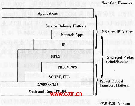 Verizon也在考慮對(duì)以太網(wǎng)、寬帶接入、VPN、VoIP及視頻傳送等戰(zhàn)略性業(yè)務(wù)進(jìn)行重點(diǎn)投資。為此,Verizon提出面向未來(lái)的IP over glass目標(biāo),涉及從傳送層到應(yīng)用層的各個(gè)環(huán)節(jié):在傳送層,將采用大容量光纖傳送技術(shù),從環(huán)形SONET向網(wǎng)狀DWDM演進(jìn),并在10~15年內(nèi)以FTTx替代銅線;在接入層,重點(diǎn)推進(jìn)以太網(wǎng)接人;未來(lái)的核心網(wǎng)將是具有QoS能力的IP/MPLS網(wǎng)絡(luò),并采用IMS實(shí)現(xiàn)核心控制功能,以支持融合業(yè)務(wù)(圖1)。