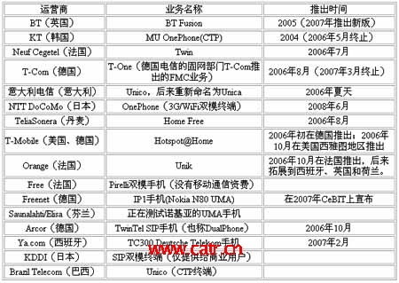 另外一個(gè)亮點(diǎn)是法國(guó)電信(Orange)于2008年11月底在Unik品牌下(Unik是Orange于2006年10月推出的FMC業(yè)務(wù)品牌,目前在法國(guó)已經(jīng)擁有100萬(wàn)用戶)開(kāi)通了高清移動(dòng)電視業(yè)務(wù),向法國(guó)用戶提供60多個(gè)高清移動(dòng)電視頻道。該業(yè)務(wù)基于Orange于2008年9月開(kāi)通的3G+UMA平臺(tái),可實(shí)現(xiàn)WiFi網(wǎng)絡(luò)與3C網(wǎng)絡(luò)的平滑切換。該業(yè)務(wù)的推出,使FMC從最初的以話音業(yè)務(wù)為主擴(kuò)展到視頻業(yè)務(wù),基于融合性終端的業(yè)務(wù)越來(lái)越豐富,是FMC領(lǐng)域的一大進(jìn)步(表1)。