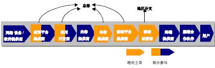 和記電訊是香港最大的流動網(wǎng)絡運營商。2004年1月,和記電訊率先在香港推出世界級的3G服務。其目標就是成為最佳的3G移動通信多媒體通信運營商。和記電訊在產業(yè)鏈上承擔的角色如圖3所示。