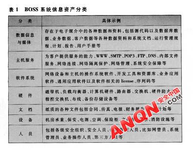 BOSS系統(tǒng)涉及的信息繁多,如何保護(hù)關(guān)鍵的數(shù)據(jù)不被泄漏是運(yùn)營商非常重視的一個(gè)問題。信息分級(jí)用來評(píng)估運(yùn)營商是否建立了信息資產(chǎn)管理的規(guī)范,明確了信息資產(chǎn)的內(nèi)容和級(jí)別,制定了有效的安全保護(hù)措施,如果沒有,應(yīng)該明確BOSS系統(tǒng)內(nèi)的關(guān)鍵信息資產(chǎn)并列出清單,依據(jù)國家保密級(jí)別制定科學(xué)的信息資產(chǎn)分級(jí)標(biāo)準(zhǔn),并作為風(fēng)險(xiǎn)評(píng)估的依據(jù)。參照國際信息系統(tǒng)安全標(biāo)準(zhǔn)BS7799/ISO17799對(duì)信息資產(chǎn)的描述和定義,可以將BOSS系統(tǒng)信息資產(chǎn)按照表1的方法進(jìn)行分類。