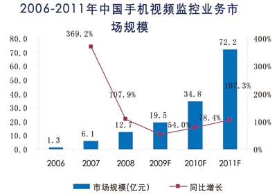 根據(jù)諾達咨詢《手機視頻監(jiān)控市場及用戶行為研究報告2009》研究結(jié)果,2006-2009年為手機監(jiān)控業(yè)務導入期,2006年手機監(jiān)控業(yè)務市場規(guī)模達到1.3億人民幣,手機監(jiān)控業(yè)務的年運營費用自2009年開始,將會逐步下降,目前平均約1000元/年,至2011年將逐步下降到600元/年,設備費用也將由目前的3000元/點,逐步下降到2011年的1000元/點。