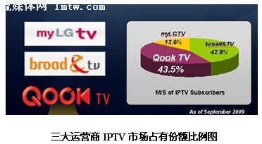 目前,在韓國的的IPTV市場上,匯集了KT、SK和LG Dacom 3家公司,其中KT旗下的QOOKTV市場占有份額是43.5%,LG Dacom旗下的myLGTV市場份額為13.6%,SK旗下broad&TV所占市場份額為42.9%,數(shù)據(jù)顯示,SK在IPTV方面的發(fā)展份額逼近KT,是KT目前最大的競爭者。