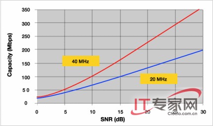 802.11n還增加了另一種新性能——更大的渠道。渠道帶寬從20MHz增加到了40MHz,等于讓可用帶寬翻了一番。下面圖表很好地展示了這一點:
