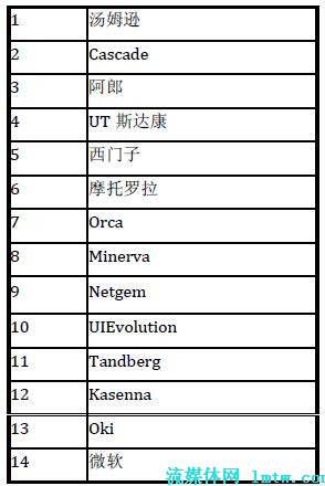 在中國市場上,UT 斯達康和中興公司暫時領先于其他公司。其中,UT 斯達康在海外也有不俗的表現(xiàn),如在印度和日本市場等;華為公司可以借助其整體解決方案的實力,有機會在下一代基于IMS 的IPTV 解決方案中脫穎而出。MRG 曾經(jīng)在2007 年3 月公布過一個市場調(diào)查,對IPTV 中間件及其市場影響力進行了一個排名,具體的結果見表1。