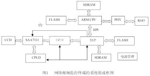 為實現(xiàn)視頻實時檢測以及網(wǎng)絡傳輸功能,本監(jiān)控終端采用ARM+DSP的體系框架,系統(tǒng)組成如圖1所示,主要包括以ARM S3C4510B為核心的主控兼網(wǎng)絡傳輸模塊,以SAA7111為核心的視頻采集模塊,以DSP TMS320C6202為核心的視頻檢測模塊,以CPLD EPM7128為核心的控制模塊,以及電源管理模塊等。系統(tǒng)具備視頻采集、視頻檢測、圖像數(shù)據(jù)的打包、網(wǎng)絡傳輸、控制等功能。其工作流程是:主控CPU S3C4510B上電初始化,SAA7111初始化,S3C4510B系統(tǒng)自檢、裝載TMS320C6202程序至RAM、啟動DSP,設定SAA7111初始參數(shù),攝像機的模擬信號經(jīng)過數(shù)據(jù)采集、緩存后,DSP及其外圍電路對其進行運動目標檢測,將檢測結果通過DSP的HPI接口傳遞給S3C4510B,S3C4510B對數(shù)據(jù)打包,建立套接字通訊服務器,等待連接進行網(wǎng)絡發(fā)送。