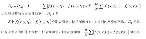 本設計中采集的是灰度圖像,為了實現(xiàn)入侵掃描功能,要求能夠存儲兩場圖像?紤]到檢測實時性要求,采用基于幀間差分的變化檢測。檢測運動目標時,考慮到對目標大小的選擇性以及為了克服光照變化引起的虛警報, 在幀間差分基礎上,引入圖像塊概念,將圖像分成M個n×n的子塊,判斷每一子塊圖像是否發(fā)生變化,統(tǒng)計發(fā)生變化的子塊數(shù)目,判斷式為: