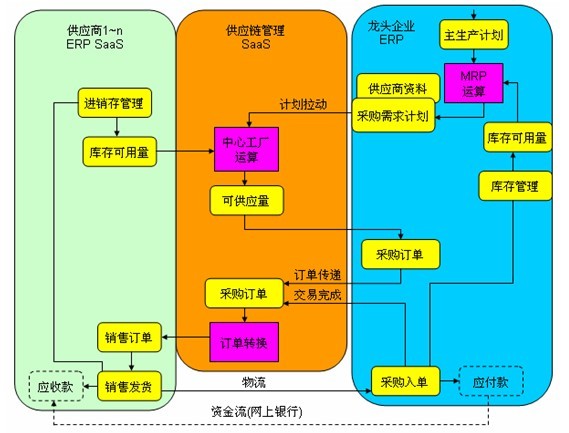 在線需求計劃管理。當龍頭完成企業(yè)內部的MRP運算后,便輸出“采購需求計劃”;該計劃作為供應鏈管理平臺,中心工廠(或稱虛擬企業(yè))運算的輸入,此刻供應鏈管理平臺可以動態(tài)地挖掘供應商的(ERP)的“庫存可用量”,并計算出“可供應量”,該數(shù)據(jù)可提供給龍頭企業(yè)編制“采購訂單”。