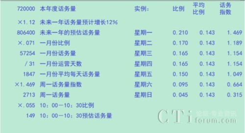 在上圖所示的比例分解過(guò)程中,我們假設(shè)去年的總來(lái)電量為720000個(gè)。在此基礎(chǔ)上,根據(jù)市場(chǎng)、銷(xiāo)售預(yù)測(cè)以及過(guò)去幾年歷史數(shù)據(jù)增長(zhǎng)趨勢(shì)等數(shù)據(jù)測(cè)算出未來(lái)一年的話務(wù)量預(yù)計(jì)增長(zhǎng)12%。這樣我們就得到了預(yù)計(jì)未來(lái)一年的總來(lái)電量為806400個(gè)。根據(jù)歷史數(shù)據(jù)的測(cè)算分析,一月份的來(lái)電量通常占全年總來(lái)電量的7.1%,因此明年一月份的來(lái)電量預(yù)計(jì)為57254個(gè)。由于呼叫中心是7X24小時(shí)運(yùn)營(yíng)的,所以一月份平均每天的來(lái)電量為57254/31=1847個(gè)。由于大多數(shù)呼叫中心的來(lái)電量規(guī)律是以一周為周期循環(huán)波動(dòng)的,因此我們接下來(lái)要測(cè)算四個(gè)(或五個(gè))周一的話務(wù)指數(shù),以覆蓋四個(gè)或五個(gè)周一的來(lái)電量情況。我們用周一來(lái)電量占全周來(lái)電量的相對(duì)比例除以其七分之一的絕對(duì)比例,得出周一的來(lái)電量指數(shù)為1.469,也就是說(shuō),周一的來(lái)電量是相對(duì)較多的,相當(dāng)于一周日平均來(lái)電量的約147%。由此我們得出周一話務(wù)量為2713個(gè)。然后我們?cè)俑鶕?jù)由歷史數(shù)據(jù)測(cè)算出的周一一天中48個(gè)半小時(shí)時(shí)段占全天來(lái)電量的比例測(cè)算出周一上午10:00-10:30的來(lái)電量為149個(gè)。剩下的周二至周日都可以采用同樣的方法來(lái)推算預(yù)測(cè)。
