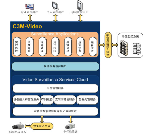 高新興通信最新推出基于云計算的C3M-Video視頻監(jiān)控管理平臺,具有視頻監(jiān)控管理平臺的通用功能和業(yè)務流程,能支持國內外主流的視頻設備。此外,能與高新興現有的動力環(huán)境監(jiān)控系統(tǒng)進行深度的融合,并以此為基礎逐步演繹成一個支撐物聯(lián)網應用的融合監(jiān)控平臺。