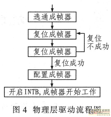 物理層通過地址總線映射配置成幀器,其中PCI橋設(shè)備和成幀器之間經(jīng)過CPLD控制選通。物理層驅(qū)動完成配置成幀器、復(fù)位控制等。成幀器是將E1上的比特流整合成符合規(guī)范的HDLC幀,其中一個標(biāo)準(zhǔn)HDLC幀包括32個時隙,這些時隙可配置映射到HDLC控制器的端口信道,實現(xiàn)2 M、N×64 K、N×8 K高速模式。其配置流程如圖4所示。