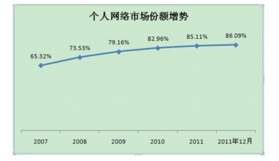 相反,固話的市場份額卻在持續(xù)下降,從2007年的19.81%到2011年12月的3.53%。手機(jī)時尚、輕便、性價比高,廣受歡迎,所以增長速度越來越快。現(xiàn)在手機(jī)已經(jīng)是尋常百姓的尋常物品了。