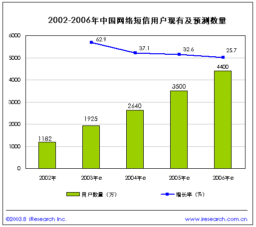 根據(jù)iResearch調(diào)查2002年網(wǎng)絡(luò)短信用戶為1182萬(wàn),占網(wǎng)民總數(shù)的20%,2003年達(dá)到1925萬(wàn),增長(zhǎng)率為62.9%,預(yù)計(jì)到2006年將達(dá)4400萬(wàn),有30%的網(wǎng)民會(huì)使用網(wǎng)絡(luò)短信,網(wǎng)絡(luò)短信市場(chǎng)將具有非常廣泛的用戶基礎(chǔ)。