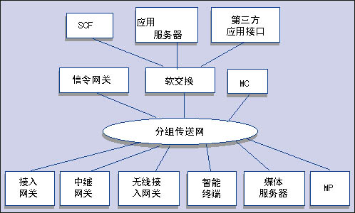 接入層包括各種接入網(wǎng)關(guān)、中繼網(wǎng)關(guān)、無(wú)線接入網(wǎng)關(guān)、智能終端以及與處理媒體有關(guān)的媒體服務(wù)器和多點(diǎn)處理器(MP)。傳送層包括提供IP包轉(zhuǎn)發(fā)的各種承載網(wǎng)功能實(shí)體?刂茖邮荖GN網(wǎng)絡(luò)的核心,主要包括軟交換設(shè)備、信令網(wǎng)關(guān)和多點(diǎn)處理器。業(yè)務(wù)層則主要包括應(yīng)用服務(wù)器、第三方應(yīng)用接口和傳統(tǒng)智能網(wǎng)功能。該業(yè)務(wù)層通過(guò)開放的業(yè)務(wù)層接口向用戶提供傳統(tǒng)智能網(wǎng)業(yè)務(wù)、多樣化的第三方業(yè)務(wù)和增值業(yè)務(wù)。