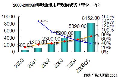 從1999年騰訊推出 OICQ 開始,短短幾年時(shí)間中,即時(shí)通信用戶數(shù)量迅速增長。在2000年至2004年期間,年增長率分別為140%、92%、70%和51%。根據(jù)易觀國際大樣本調(diào)研的結(jié)果,到2005第三季度中國即時(shí)通訊用戶數(shù)量增長到8,152萬,比去年增長38%。