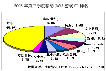 計(jì)世資訊(CCW Research)數(shù)據(jù)顯示,2006年第三季度中國(guó)手機(jī)游戲市場(chǎng)規(guī)模達(dá)到6.7億元人民幣,比第二季度增長(zhǎng)11.9%。 手機(jī)游戲市場(chǎng)規(guī)模包括移動(dòng)運(yùn)營(yíng)商、手機(jī)游戲服務(wù)提供商在手機(jī)游戲業(yè)務(wù)上的總體收入,但不包括手機(jī)游戲軟件開(kāi)發(fā)商的收入。第三季度,短信游戲增速繼續(xù)放緩,短信游戲市場(chǎng)規(guī)模達(dá)到1.8億元,占手機(jī)游戲市場(chǎng)份額的26.5%。WAP,JAVA和BREW游戲繼續(xù)保持快速增長(zhǎng),第三季度WAP、JAVA和BREW游戲市場(chǎng)規(guī)模分別為2.8億元、1.4億元和0.7億元。