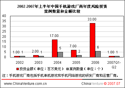 ChinaVenture分析師指出,除2006年觸通安騰和掌上明珠依靠手機網(wǎng)游業(yè)務(wù)獲得數(shù)百萬美元投資外,其余企業(yè)獲融資原因均為投資商看好手機單機游戲業(yè)務(wù)。2007年之前由于手機網(wǎng)游市場規(guī)模過小,加上無線網(wǎng)絡(luò)環(huán)境制約,風(fēng)險投資商大多抱以觀望態(tài)度。